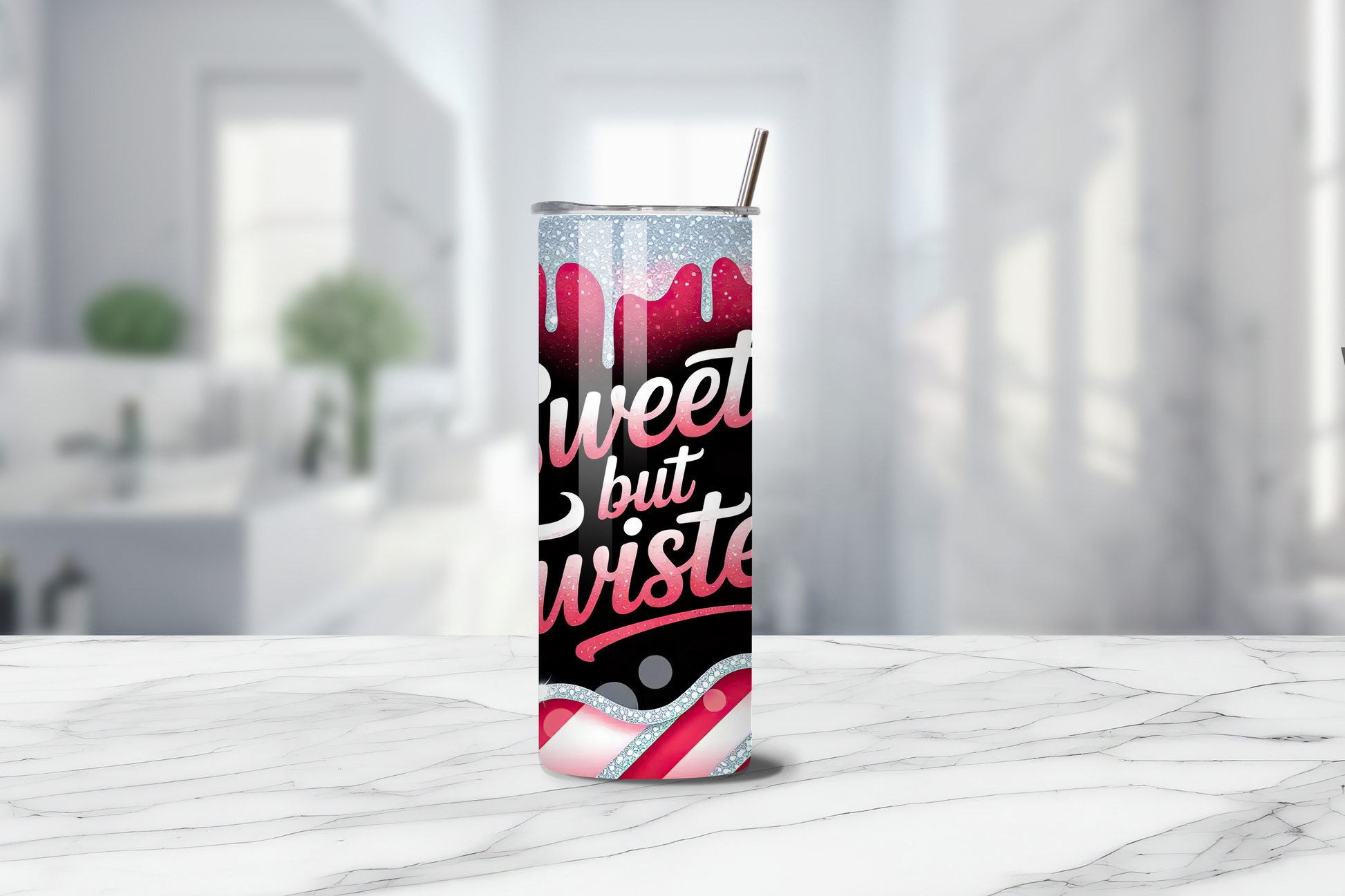 Show off your sweet side — with a little edge! This Sweet but Twisted 20oz stainless steel tumbler features a candy-cane-inspired pink and red design with shimmering glitter drips and playful typography. Perfect for those who love a festive vibe with a bit of sass. Keeps your drinks hot or cold while adding sparkle to your day!